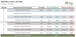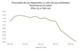 Considerando el rendimiento de un depósito a plazo fijo con vencimiento a 365 días que pagó los intereses en abril del 2024 (pero que tomaste en abril del 2023) las opciones más rentables destacaron los depósitos en soles, que en promedio obtuvieron rendimientos superiores al 7%.