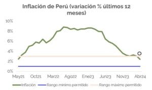 Después de que la inflación alcanzara máximos de hace 25 años (8.81%), esta comenzó a disminuir producto de las altas tasas de interés y generó que comenzaran el ciclo de reducción de tasas a mediados del 2023. Sin embargo, el dato de inflación de Perú de abril del 2024, mostró que la inflación se ubicó en 2.42%, un dato que se encuentra dentro del rango objetivo del BCRP del 1 – 3%, mostrando la efectividad del BCRP para manejar la inflación.