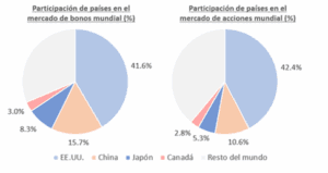 A la fecha, EE.UU. lidera tanto el mercado de bonos ($51.3 billones) como el de acciones ($46.2 billones), representando el 41.6% y el 42.4% del mercado global de cada activo, como se muestra en la siguiente imagen.
