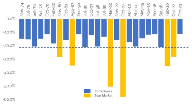 Desde 1974 hasta el 2023, el S&P 500 ha tenido 26 correcciones, lo que significa que estas ocurren, en promedio, cada dos años. Cabe mencionar que cada vez que ocurre una corrección, el temor de que el S&P 500 entre en terreno bajista (‘bear marke’t: caída de mercado mayor al -20%) aumenta.