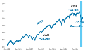 Y es así como las expectativas pasaron de positivas a negativas, llevando a que el S&P 500 retroceda -10.2% desde su punto más alto, lo que en inversiones se conoce como corrección. Esta corrección fue la quinta más rápida de la historia e interrumpe lo que ha sido el mejor período de dos años (2023: +26.06 y 2024: +24.88%) para el mercado desde el auge de las puntocom a finales de los 90.