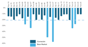 La historia indica que, en los últimos 50 años, han ocurrido 27 correcciones y solo 6 de ellas han terminado en un ‘bear market’, es decir, en caídas mayores al 20%, donde ocurrió una recesión o la expectativa de que esta ocurriera era muy alta, como lo fue en 2022.