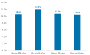 Independientemente de que los riesgos que puedan surgir en el corto plazo, recomendamos invertir en el único mercado de acciones que ha rendido de manera consistente en el tiempo. La historia demuestra que en los últimos 100, 50, 30 y 20 años, el S&P 500 ha pagado alrededor de +10.9% en promedio.